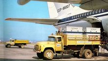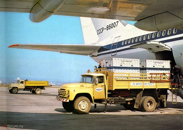 ЗИЛ-130 и ГАЗ-53А подготавливают к взлету самый большой советский лайнер - ИЛ-86. Именно этот самолет в 1984 году при аварийной посадке почти полностью сжег шасси. Никто не пострадал.