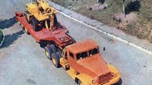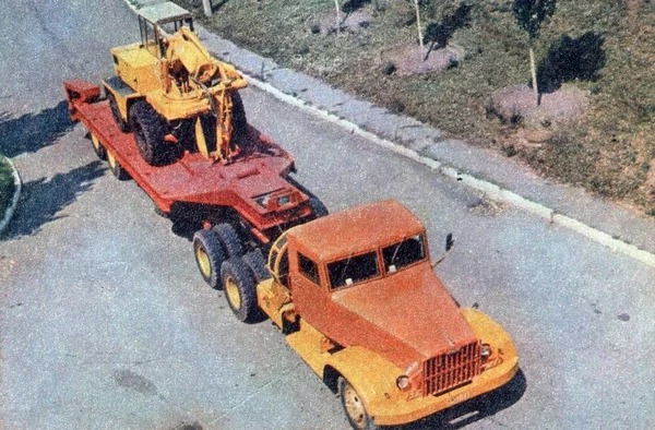 Мы не привыкли видеть грузовики КрАЗ в такой пёстрой окраске. Этот окрашен в оранжево-желтые цвета, а прицеп - в ярко-красный.