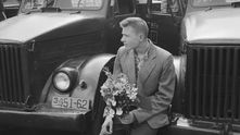 Милая фотография. Водитель грузовика ГАЗ-51А ждет свою невесту с букетом цветов. Обратите внимание на ранние номера на грузовиках, включающие индекс модели.