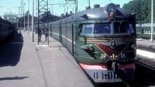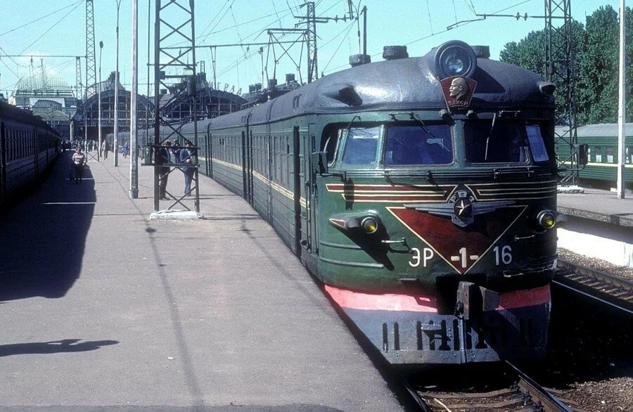 Классическая зеленая электричка ЭР-1 на вокзале в Ленинграде. В настоящее время такие сняты с эксплуатации. Обратите внимание на комсомольский значок над лобовым стеклом.