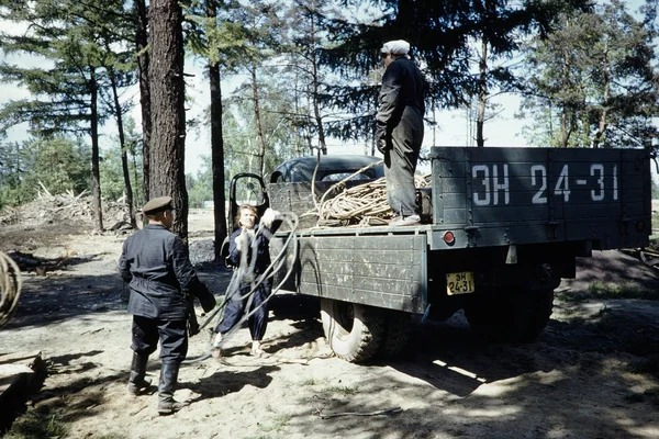 1959 год. Грузовик ЗИС-150 на строительстве павильона Американской выставки в Сокольниках. Идет погрузка крановых строп.