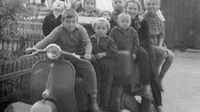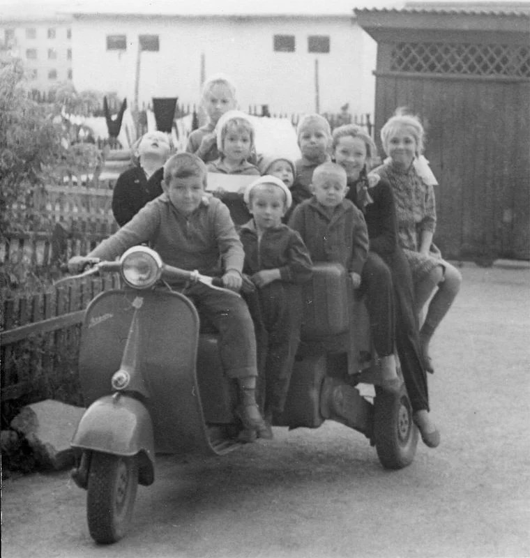 Дети на редком грузовом мотороллере ВГ-150. Конечно, детям водить такой было нельзя, так что это лишь постановочная фотография, но зато какие счастливые лица!