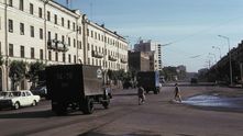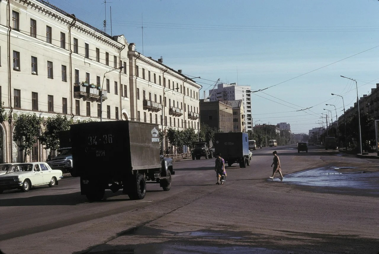 Улица Ленина в городе Омск. Фотография сделана иностранным журналистом Густавом Нейеншвандером в 1979 году. На переднем плане - два фургона на шасси ГАЗ-53А.