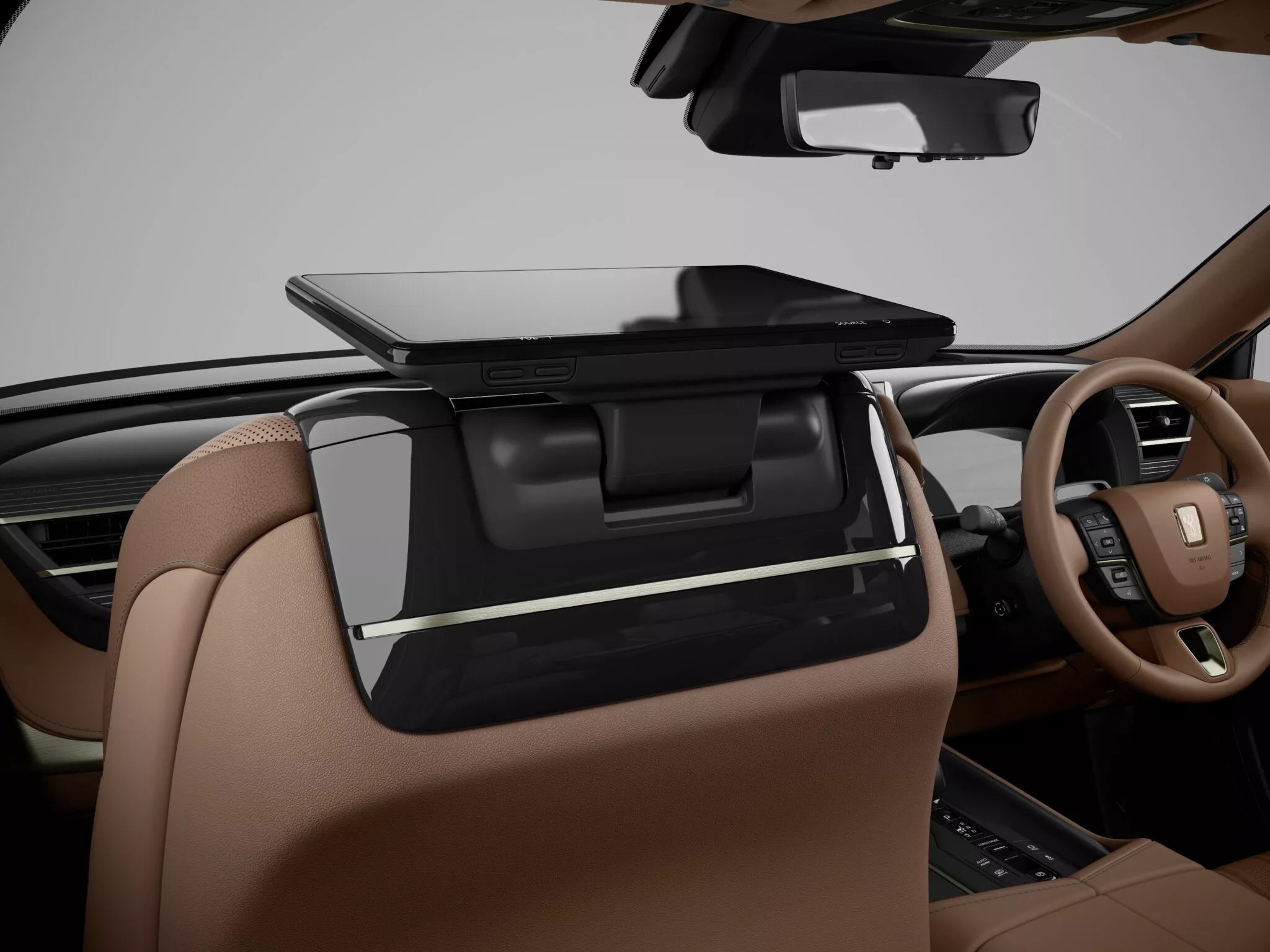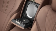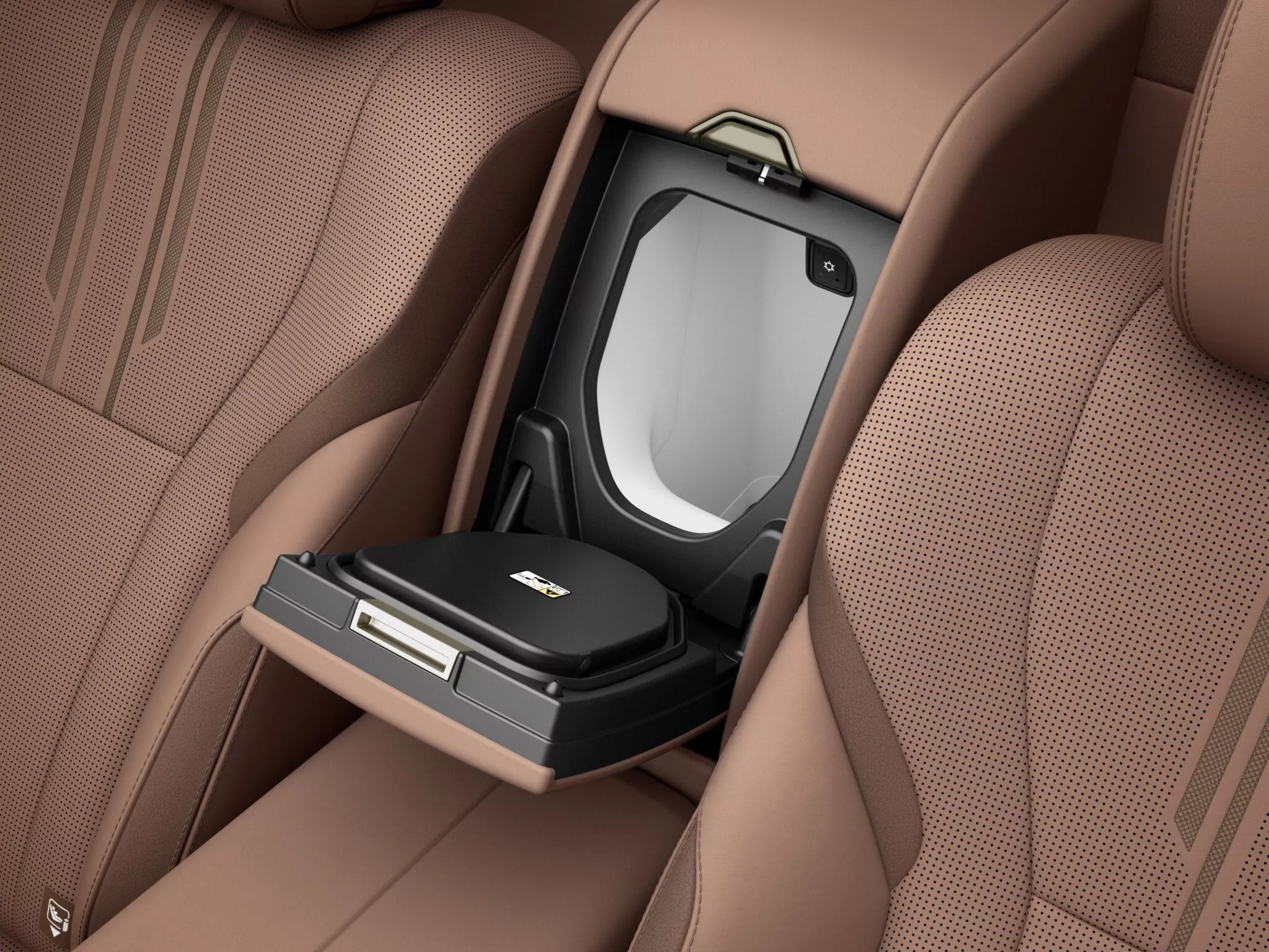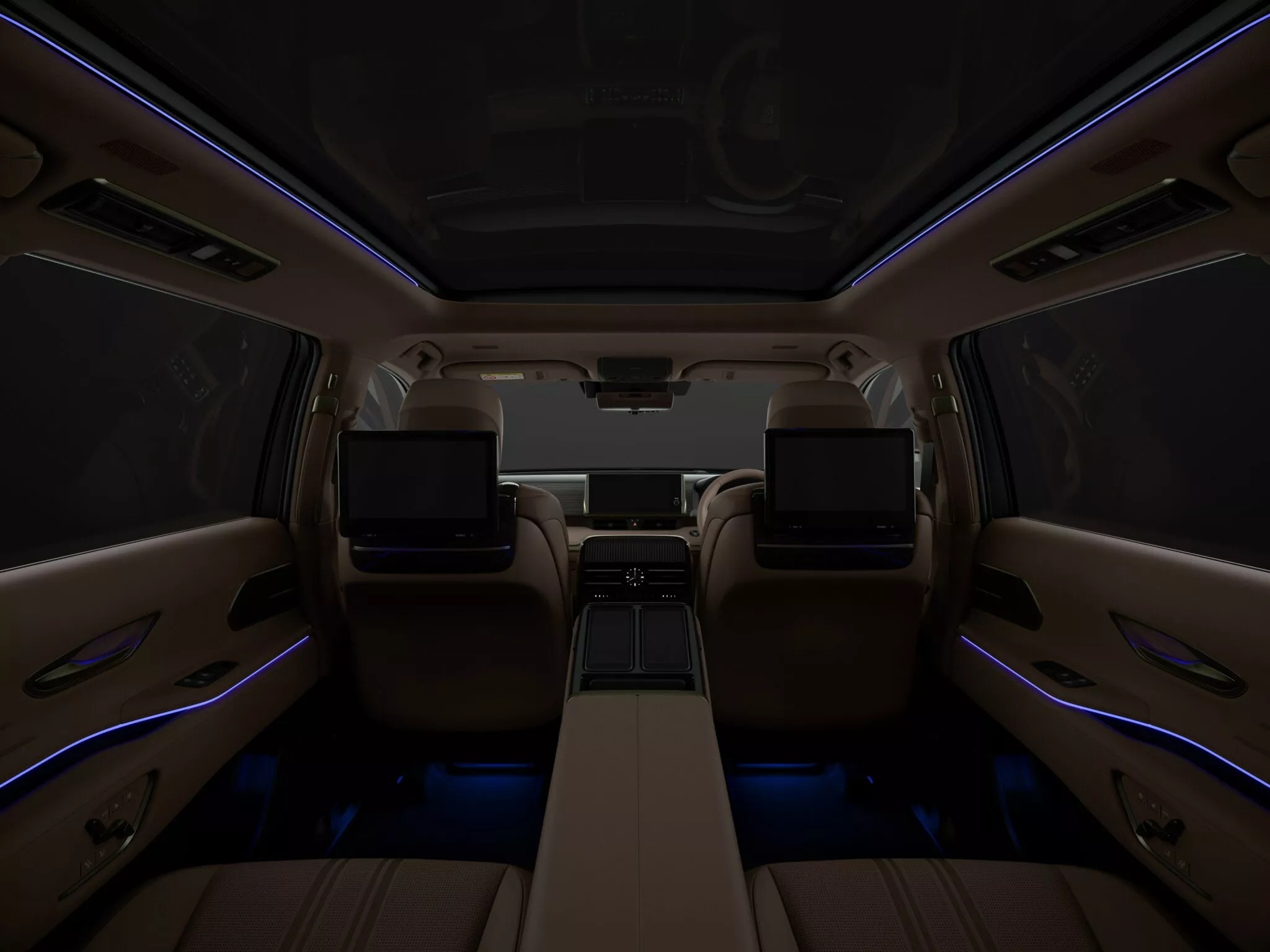 Самое главное – это отдельная задняя центральная консоль с дефлекторами вентиляции и часами, а также складные задние мониторы и два функциональных дисплея в подлокотнике.