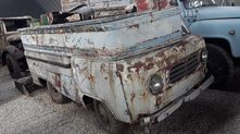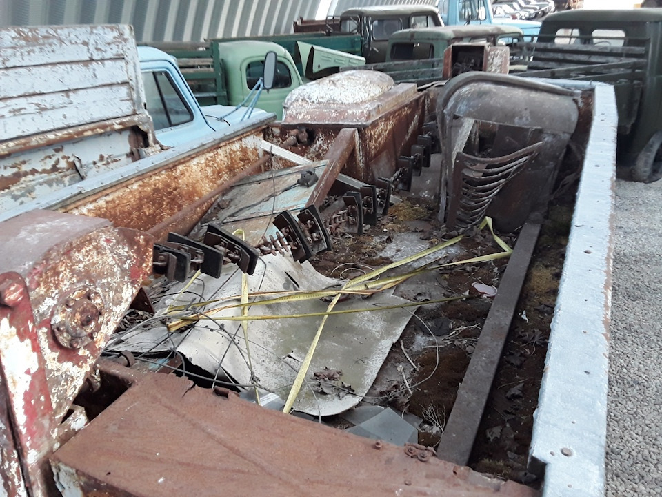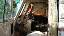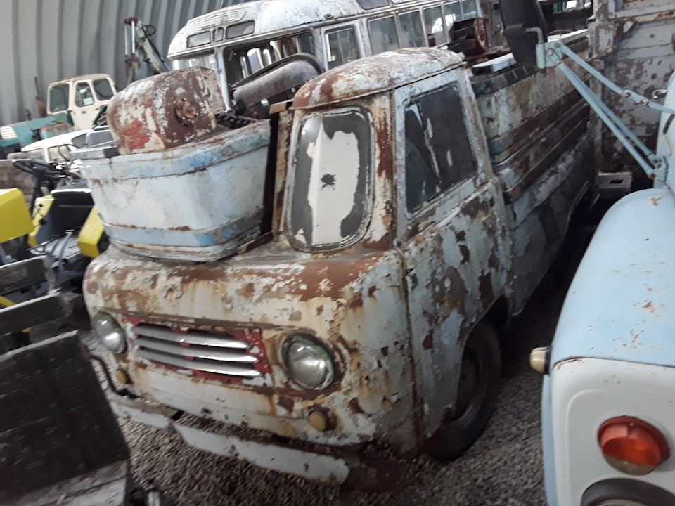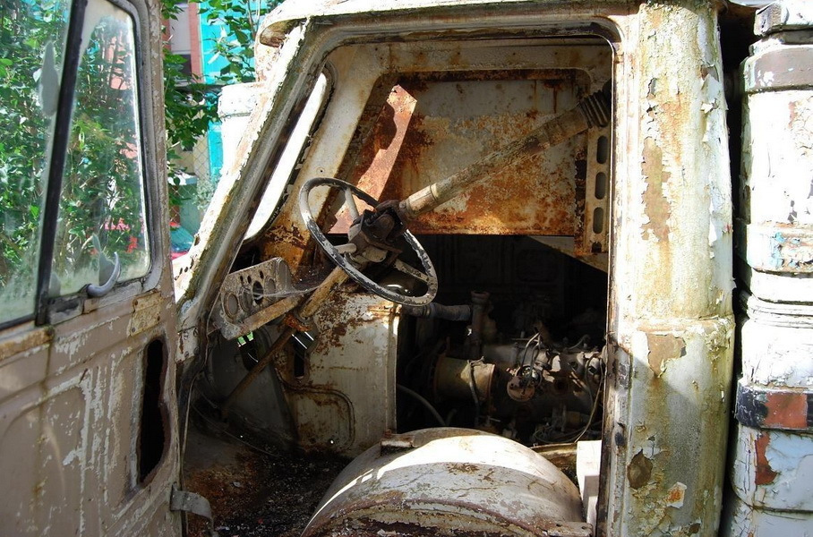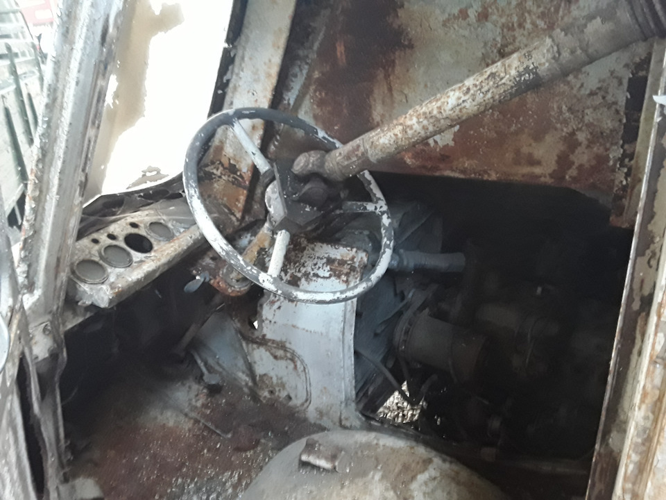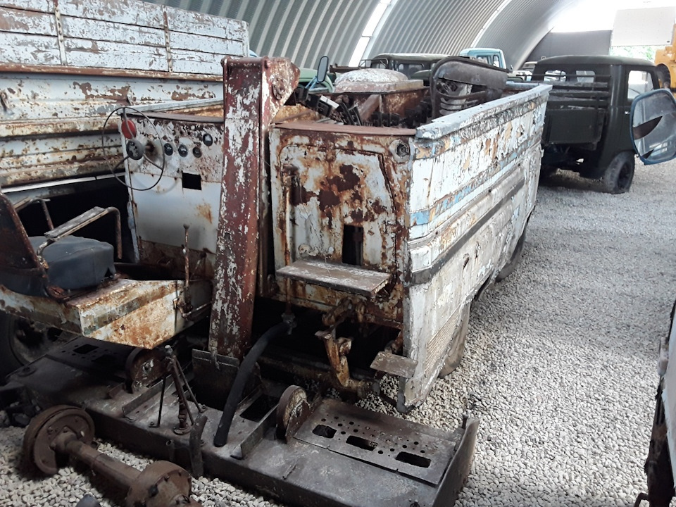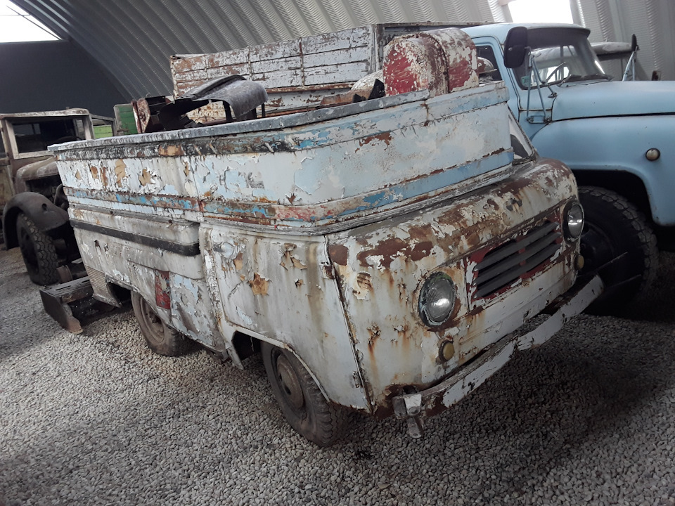 Обратите внимание на крохотную кабину с закрашенными окнами. Дело в том, что водитель сидел вовсе не там, а в задней части платформы. Но рулевое колесо сохранилось на обычном месте, а к нему в районе кнопки сигнала крепился карданный шарнир, к которому подходил вал от руля расположенного сзади. Спасибо портал Uazbuka.ru за эти фотографии.