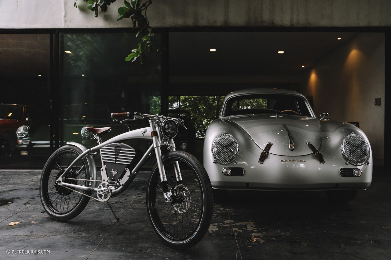 Теперь он создает реплику гоночного 356A Outlaw с двигателем от позднего SCCA. Причем коллекционер даже купил стильный винтажный электробайк Vintage Electric Outlaw Tracker, который дополнит этот проект.