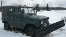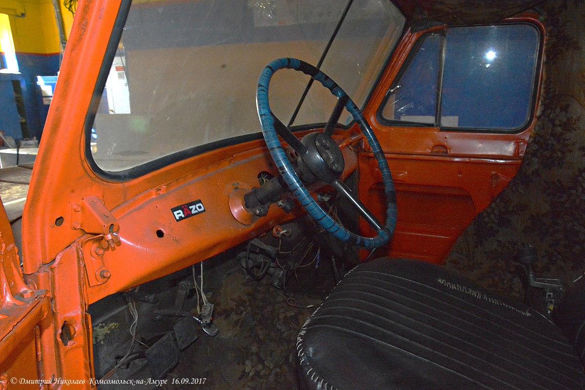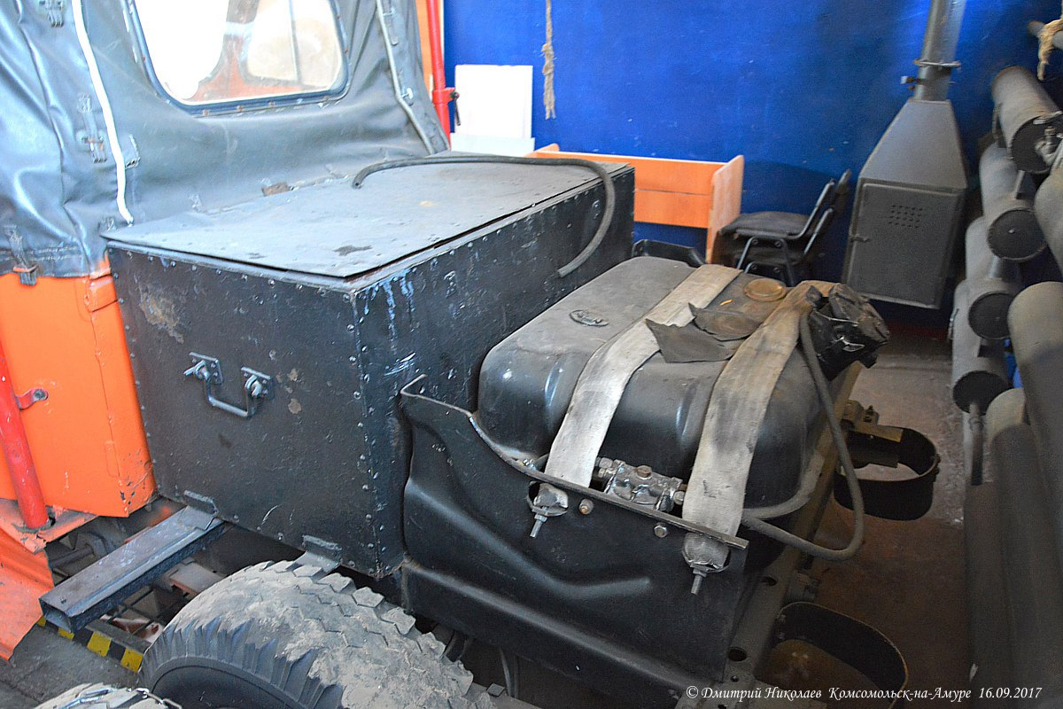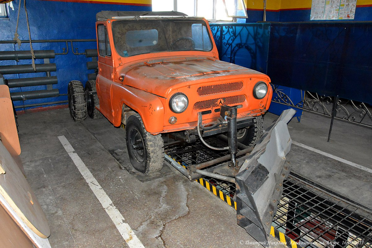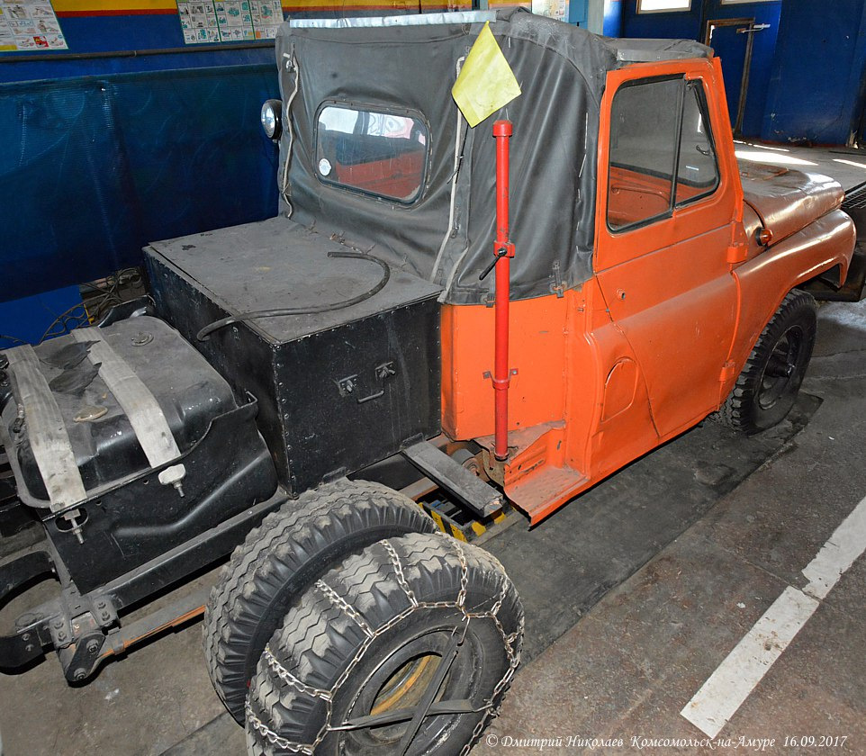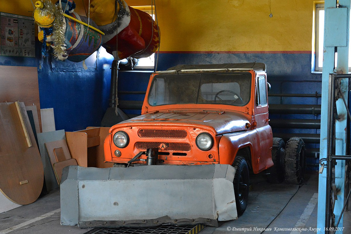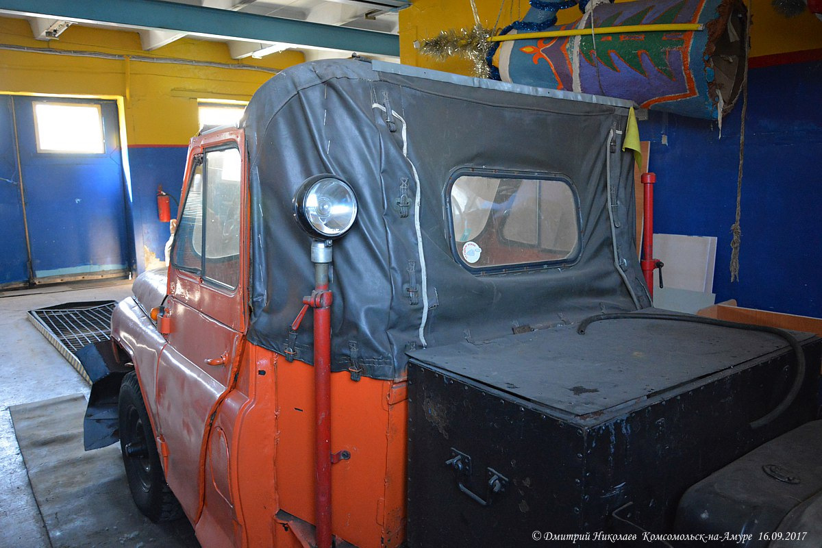 Дмитрий Николаев сфотографировал очень интересный УАЗ-469 в пожарной части в Комсомольске-на-Амуре. Короткая кабина, снегоуборочный отвал спереди, сдвоенная резина сзади с цепями противоскольжения.