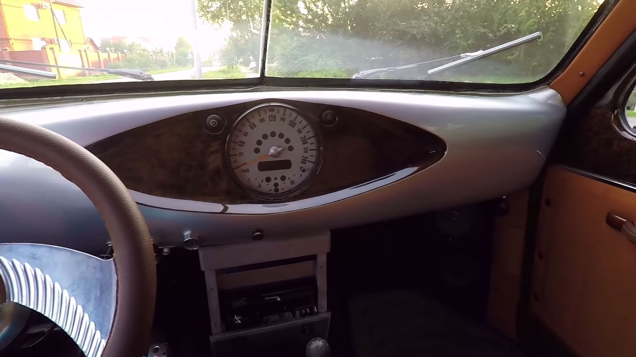 Двери открываются против хода движения автомобиля. В салоне также от «Победы» практически ничего не осталось. Внутри царит минимализм, характерный для автомобилей того времени. Фактически, тут есть лишь хотроддерский руль и спидометр в деревянной окантовке, установленный по центру.