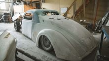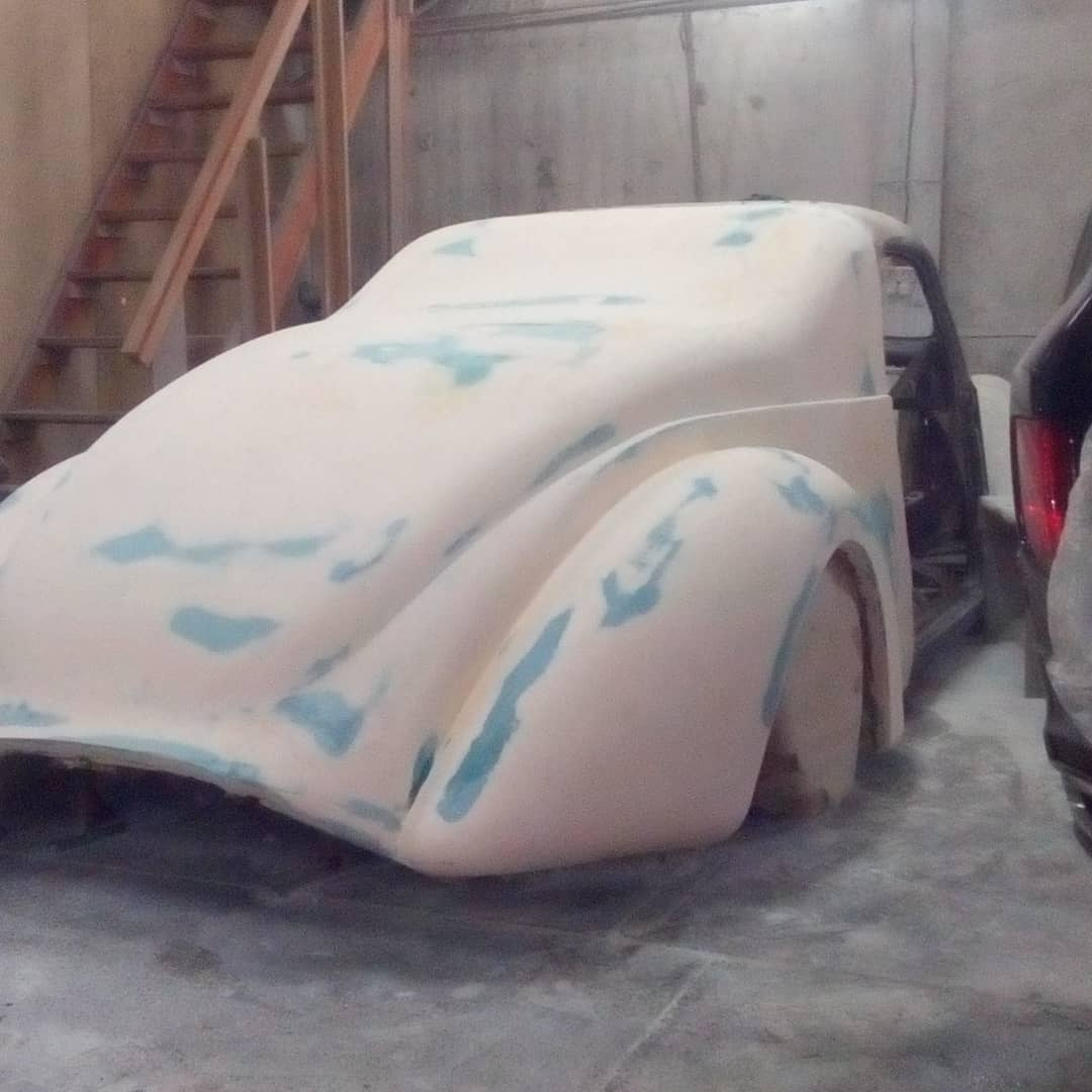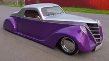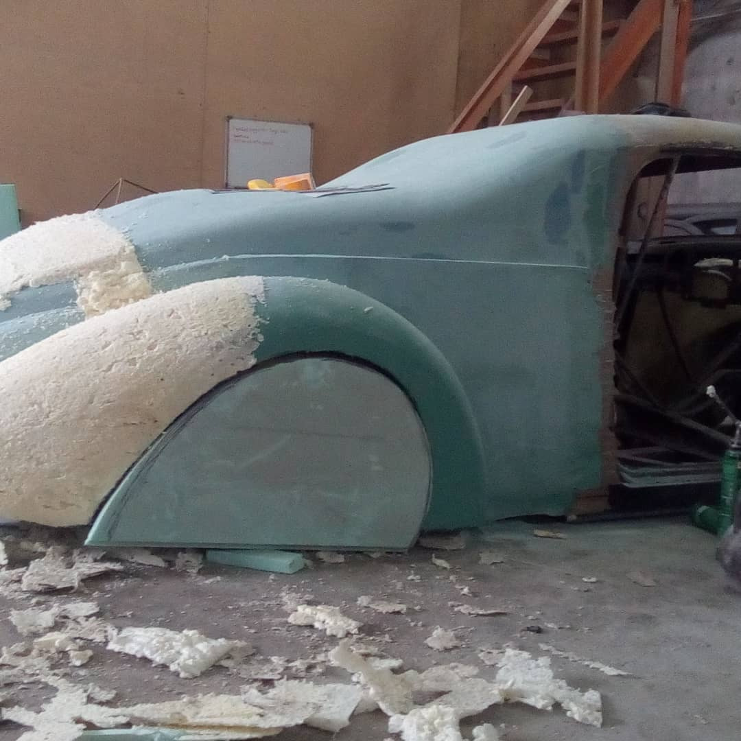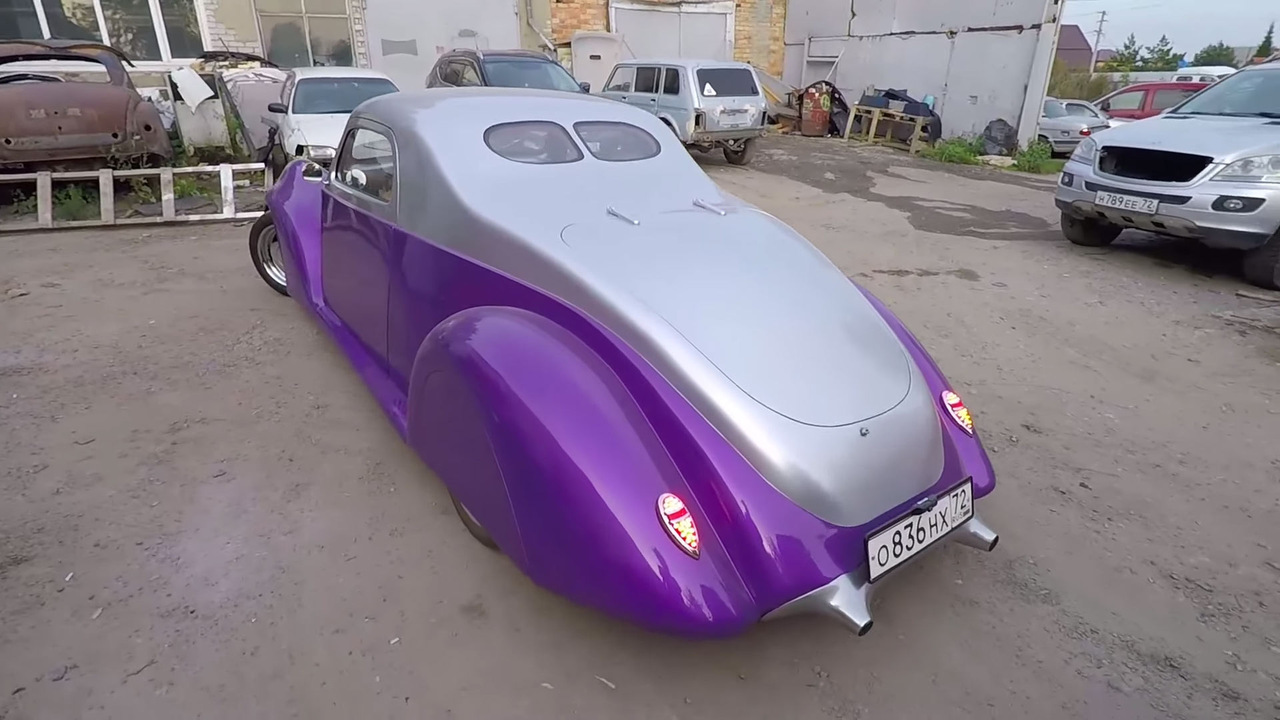 Получилось действительно очень неплохо. Никаких острых углов, только покатые линии. Необычное сочетание вздернутой передней части и очень длинной задней части с крышей, плавно переходящей в багажник. Фары, кстати, тут от оригинального Lincoln Zephyr 1937 года, заказанные в США.