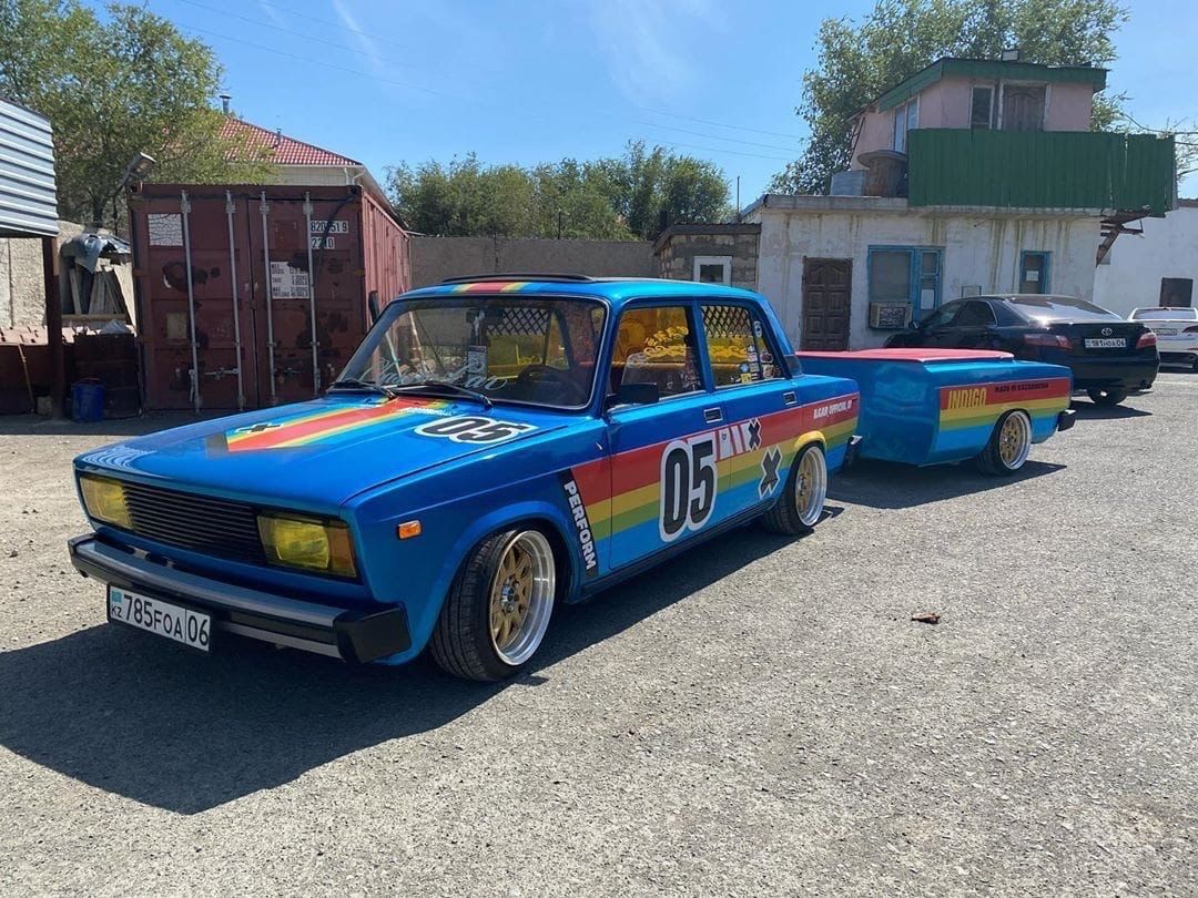 Это может звучать немного странно и удивительно, но в Казахстане сложилась достаточно мощная школа тюнинга. Один только доработанный универсал ГАЗ-24-02 «Волга» чего стоит! Вот еще один нестандартный проект — заниженный ВАЗ-2105 в забавной расцветке с прицепом в едином стиле.