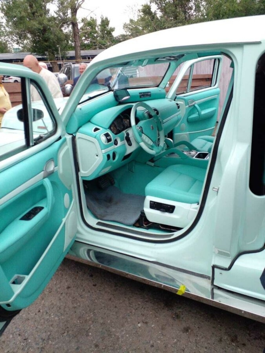 Салон практически целиком заимствован у Porsche Cayenne первого поколения, но перешит в кожу мятных цветов.
