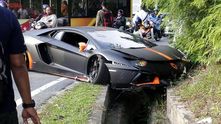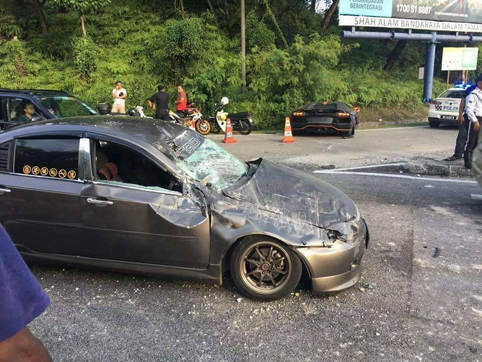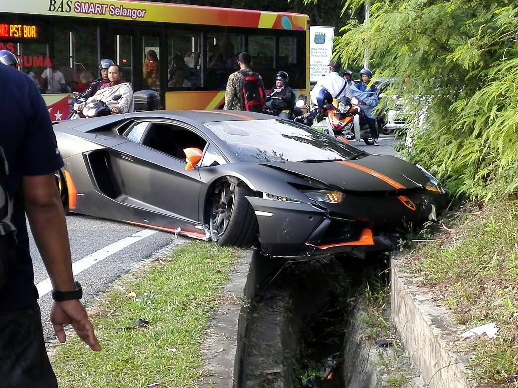 Как можно видеть, Aventador пролетел над серым Proton Persona, прежде чем приземлиться в канаву.
