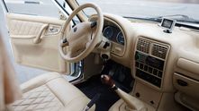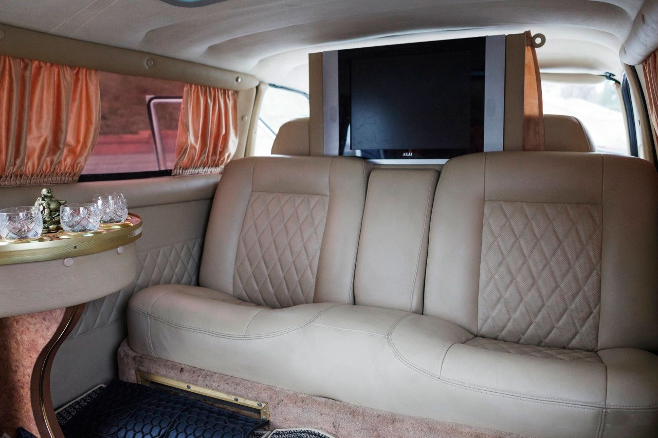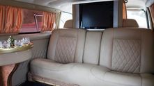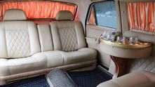Салон просто шикарен. Практически все элементы обшиты натуральной кожей кремового цвета. Задний диван отформован для двоих и должен обеспечить максимальный комфорт для жениха и невесты. Свидетели смогут расположиться на почти таком же диванчике, расположенном напротив. Подголовников у него нет из-за огромного телевизора марки Akai, установленного между передним и центральным рядом сидений.