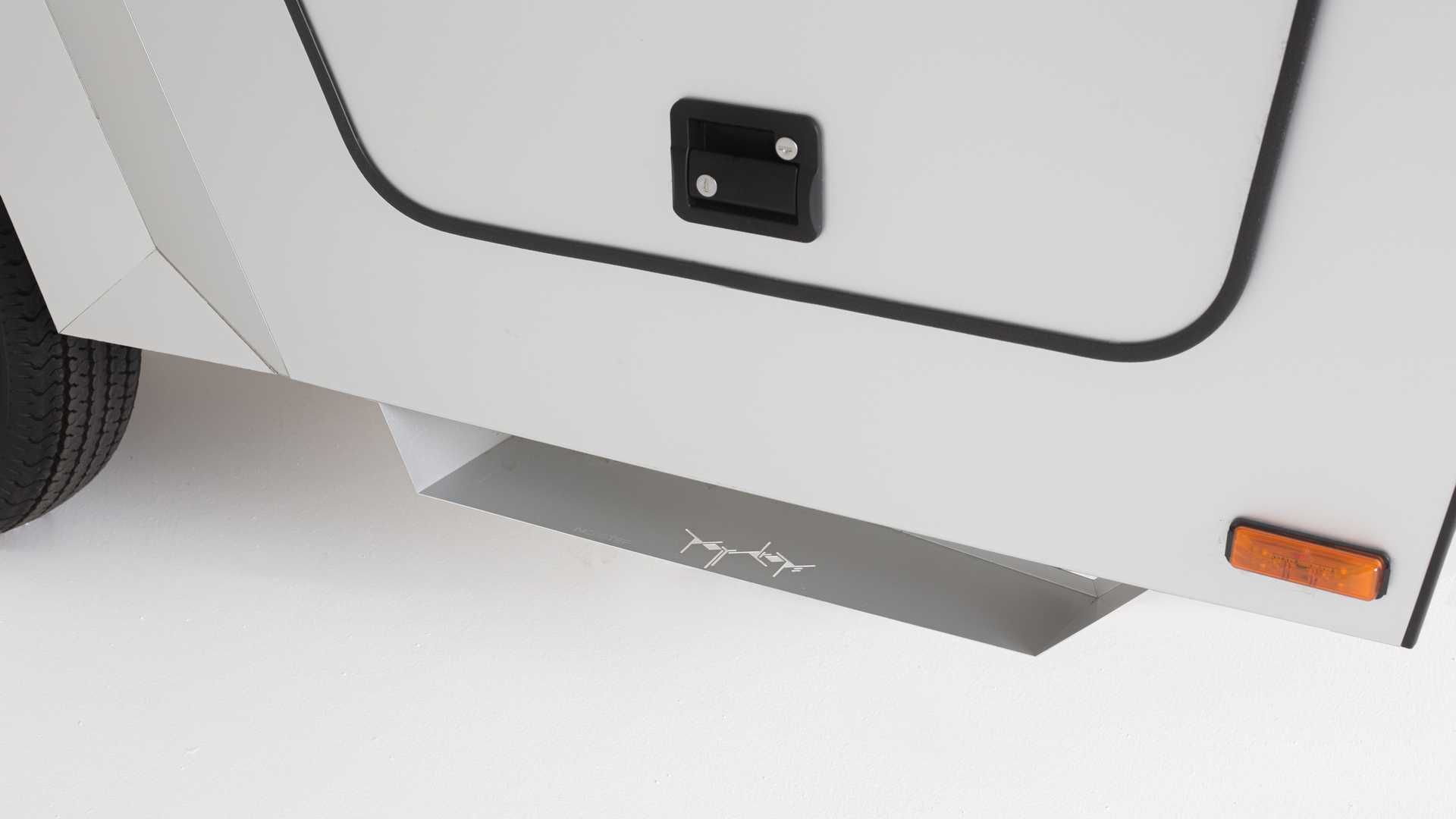 Прицеп оснащен собственным штатным аккумулятором, который скрывается в полу. Покупателям будет доступно три варианта батареи: на 2,4, 4,8 и 12 кВт/ч. Последней хватит на то, чтобы прожить в прицепе автономно с электричеством целых шесть дней.