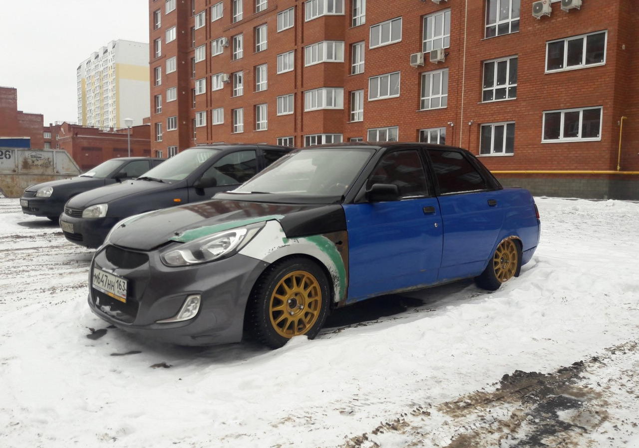 В одном из обычных дворов города Тольятти стоит довольно любопытный ВАЗ-2110. Фотографии этого автомобиля выложил в социальные сети Игорь Чернявский. Похоже, что один из местных умельцев решил объединить кузов «десятки» с передней часть от Hyundai Solaris первого поколения.