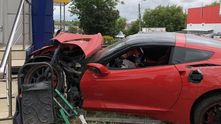 Удар был такой силы, что Рено отбросило на десяток метров назад, а Corvette врезался в крыльцо ломбарда. По словам водителя Корветта скорость в момент удара была 75 км/ч. Конечно, это враньё и попытка снять с себя вину.