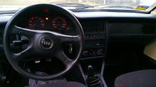 Царство немецкого олдскула продолжается в салоне. Стандартные «москвичовские» пластиковые детали сочетаются с передней панелью, рулем и сиденьями от Audi 80. Хочется отметить, что выглядит такая панель намного приятнее совершенно отвратительной (как по дизайну, так и по качеству сборки) заводской детали.