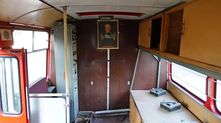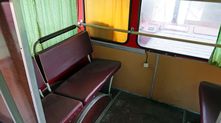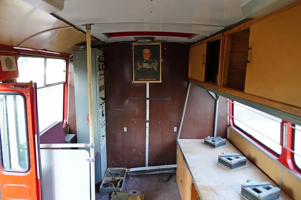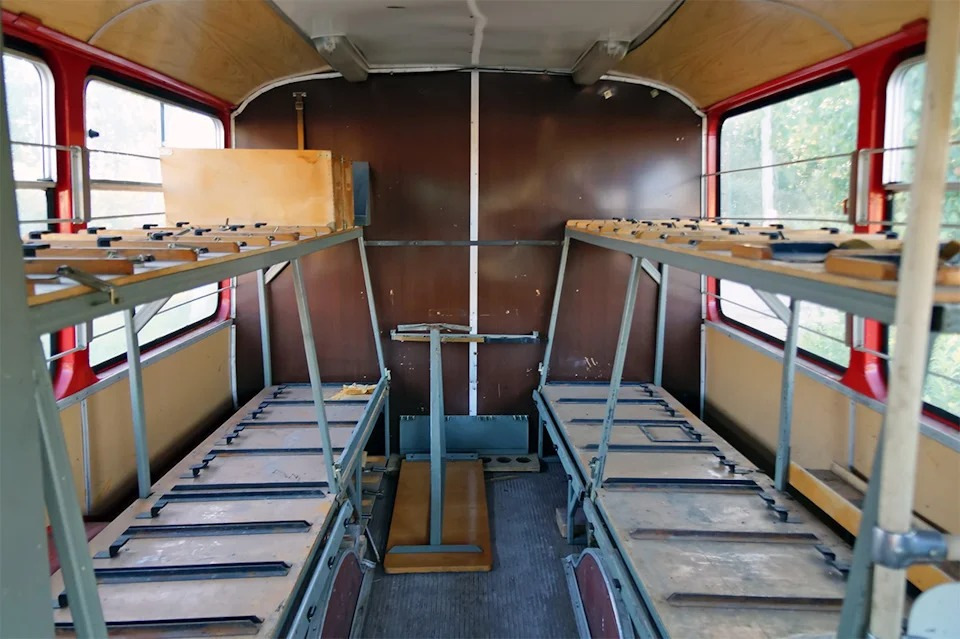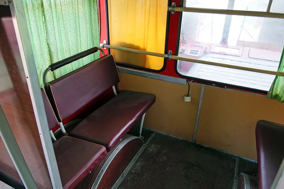 Салон телевизионного ЛиАЗ-677 разделен тремя деревянными перегородками: одна отделяет кают-кампанию с двумя диванами, а вторая сплошная делит салон на две части.