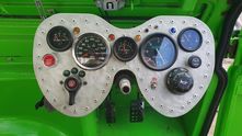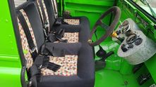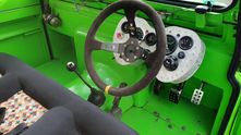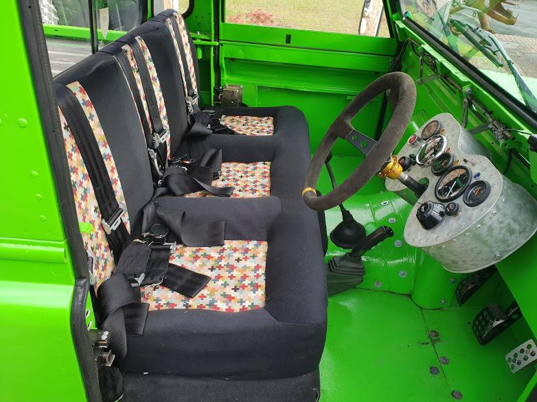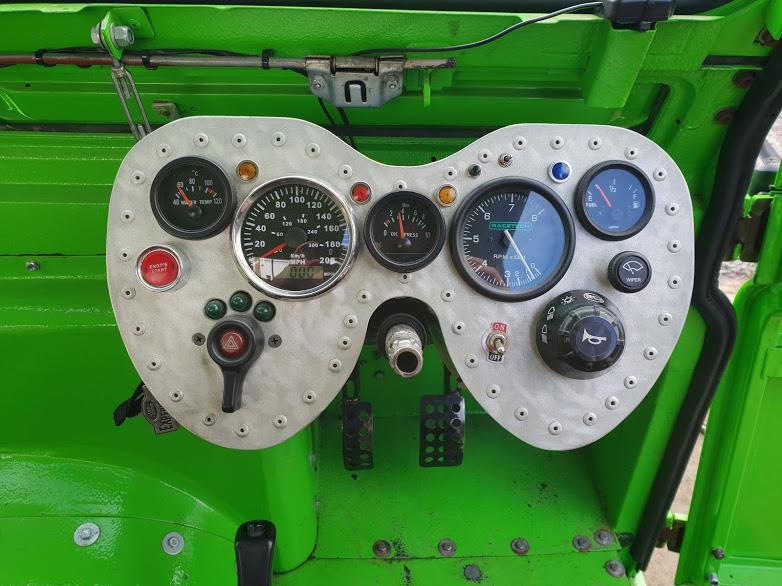 В кабине всё по спортивному спартански. Панель приборов странной формы сделали из алюминия. Трехместный диван с пятиточечными ремнями безопасности также самодельный.