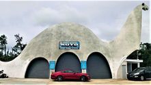 Если проехать пару километров к северу, то вы увидите Автоцентр Гарольда. Гараж с тремя отсеками построен внутри бетонного динозавра. Он еще больше: 33 метра в длину, 9 метров в ширину, 10 метров в высоту до спины и 14,5 метров до макушки.