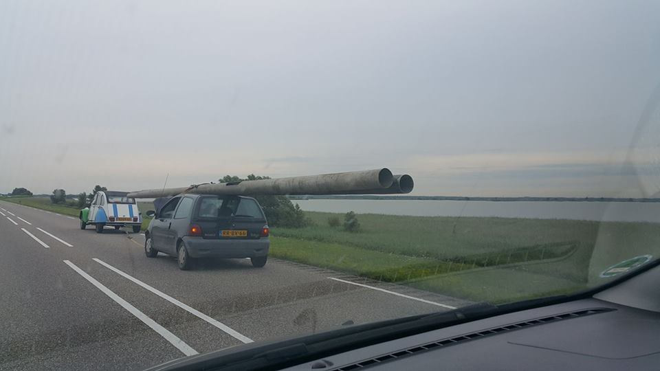 Как можно видеть из фото, какой-то чудак на своем маленьком Renault Twingo перевозил огромные (по виду около 10-12 метров) опоры под уличные светильники, которые водитель каким-то образом прикрепил на крыше своего автомобиля.