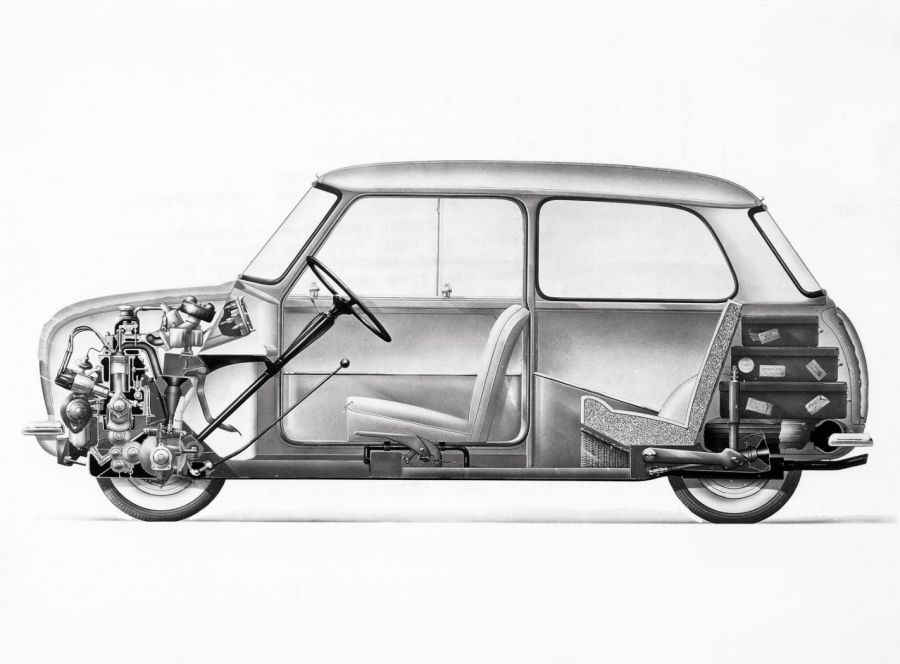 Алек Иссигонис, уже прославившийся как создатель Morris Minor, получил эту задачу. Его решение было одновременно простым и радикальным: установить двигатель поперечно, коробку передач разместить под ним, колёса разнести по углам кузова, а всё остальное пространство отдать пассажирам.