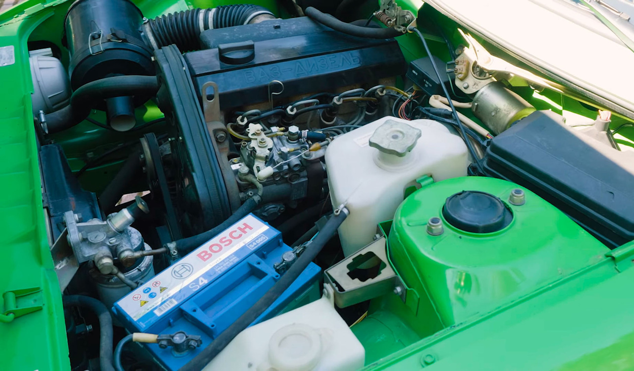 Но самое любопытное скрывается под капотом. Там находится отечественный дизельный мотор ВАЗ-341, а на головке блока цилиндров написано гордо «ВАЗ-ДИЗЕЛЬ». Этот 1,5-литровый атмосферный силовой агрегат выдавал мощность около 53 л.с. Им комплектовались ВАЗ-2104 в очень небольших количествах.