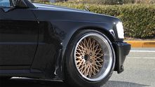 Автомобиль был куплен примерно 3 года назад, и его новый владелец твердо решил установить 18-дюймовые колеса. Но для этого потребовалось изменить колесные арки и поставить оригинальные расширители спереди и сзади, которые сделали внешность немецкого «малыша» гораздо более мускулистой. В некоторых ракурсах он смотрится злее омологационного 190E Evo.