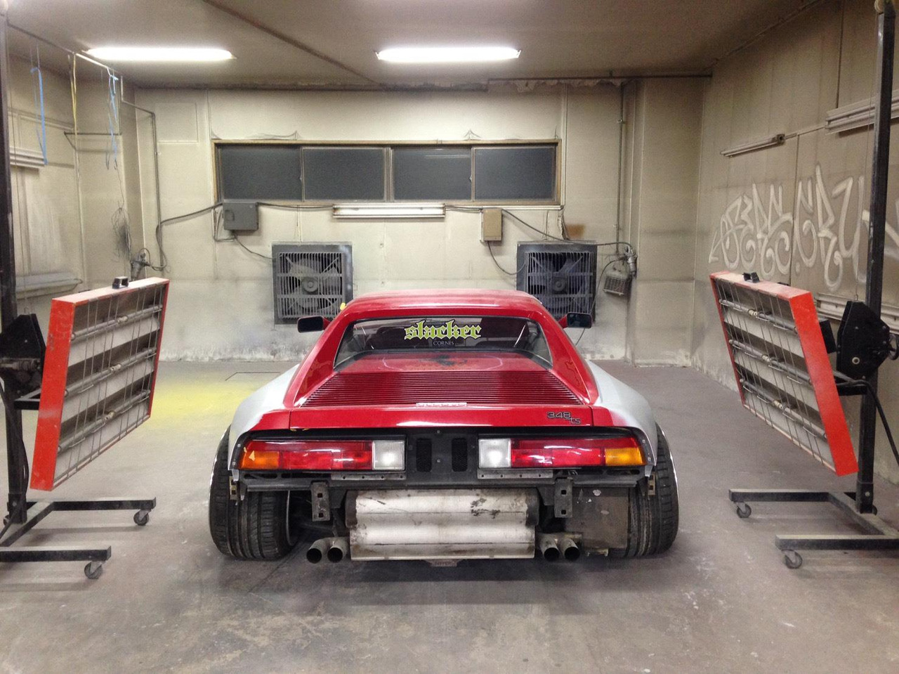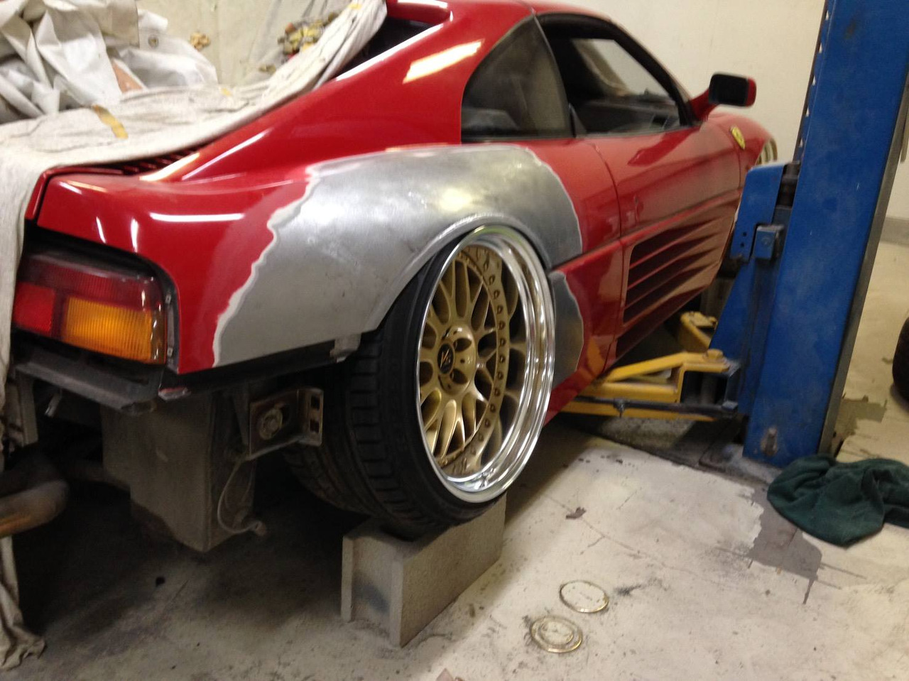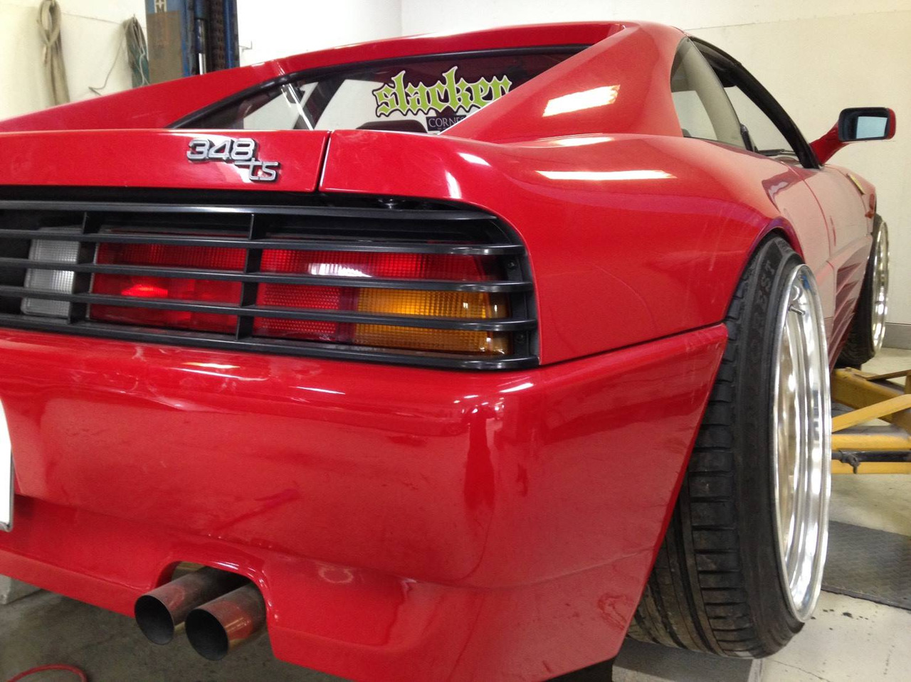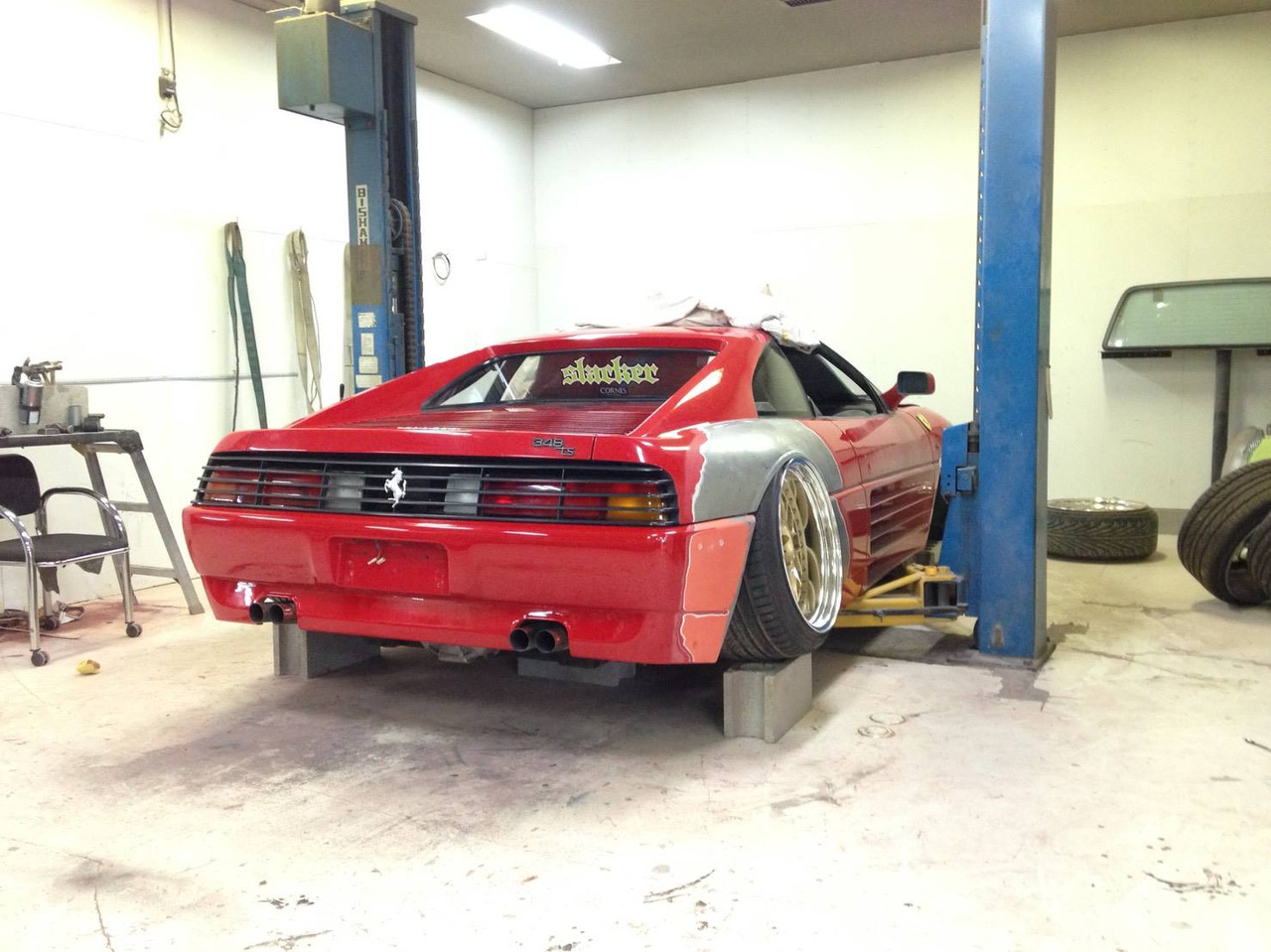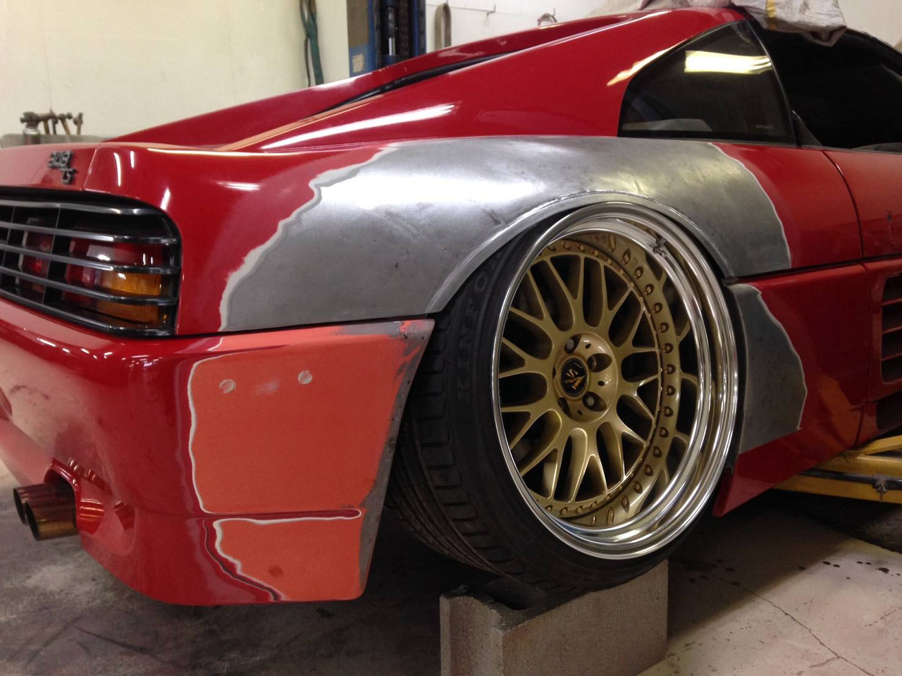 Время, в которое мы живём, легко можно назвать эрой заниженных машин. Их популярность только растёт, и как именитые тюнеры, так и обычные автовладельцы, стараются «занизить» любой автомобиль, что попадётся им под руку. Особенно популярна эта тема в Японии, там вы можете увидеть заниженными самые разные автомобили. Японское ателье FERS.CRU захотели удивить общественность и поработали над Ferrari 348. Заднеприводный спорткар с двигателем V8 – довольно неплохой материал для работы, к тому же вполне приемлимый по цене, особенно если сравнить с другими подобными автомобилями. Основной задачей у них, конечно же, было сделать автомобиль как можно «ближе к земле». И нужно сказать, у них получилось. Клиренс настолько мал, что практически не остаётся просвета. К счастью, автомобиль оснащён пневмоподвеской и после показа и фотосессий, его можно вернуть в более приемлимый хоть для какой-то поездки вид. Основная работа над спорткаром состояла в расширении колёсных арок таким образом, чтобы колёса под них заходили.