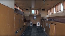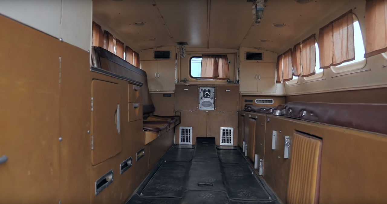 В задней части расположился пассажирский отсек, где есть один диван, двое носилок, несколько ящиков для специализированного оборудования (в том числе медицинского), небольшая мойка, кондиционер, печка и даже крепление для физраствора на потолке.