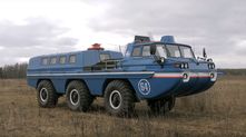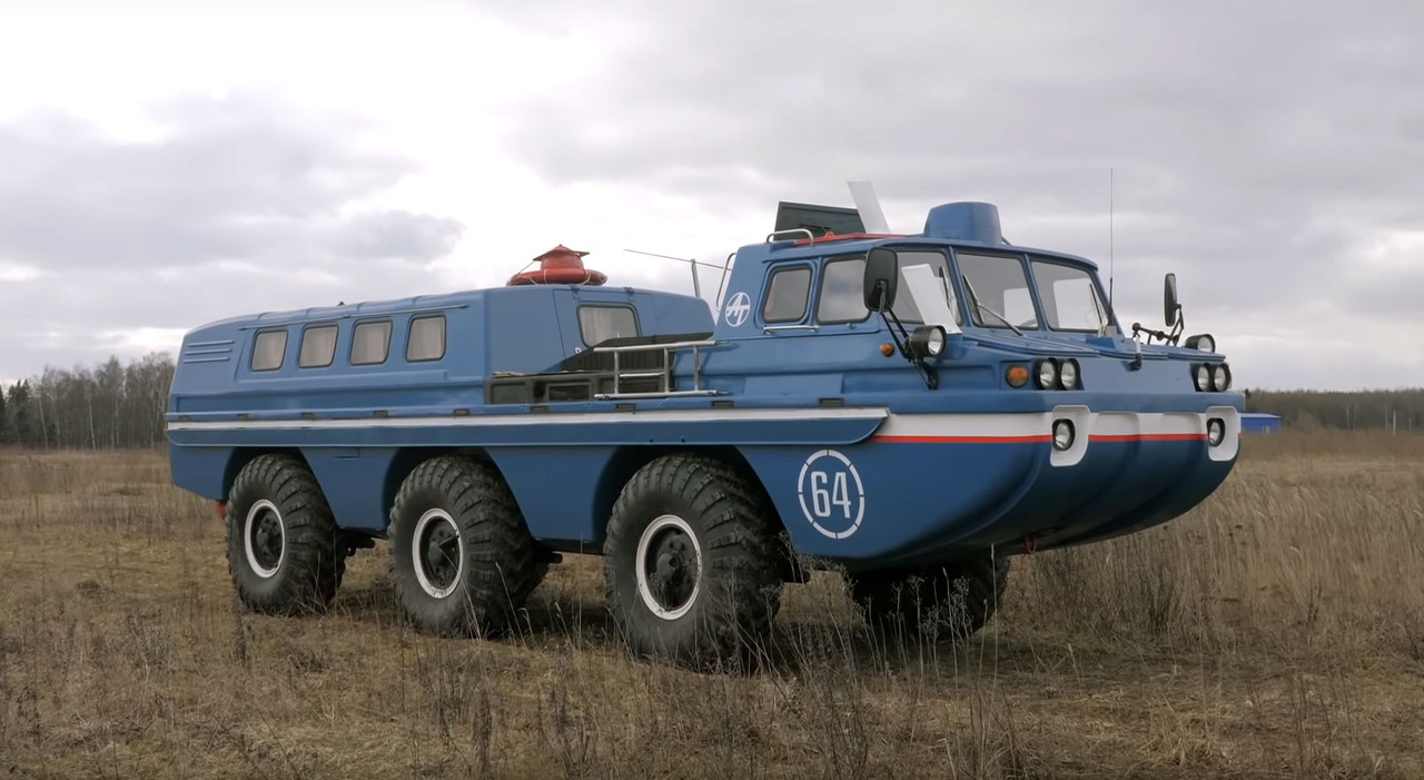 Кузов изготовлен из стеклопластика и опирается на дорогу при помощи шести внедорожных равноразнесенных колес. Это обеспечивает невероятную проходимость, а еще ЗИЛ-49065 может плавать: в задней части установлено два гребных винта, вращающиеся при помощи отдельных карданных валов.