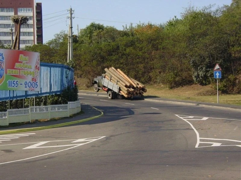 А наш старенький ЗИЛ-130 не справился со своей ношей. Бревна перевесили его назад, и кабина беспомощно взмылась вверх. Теперь только разгружать.
