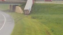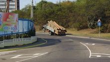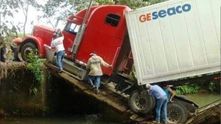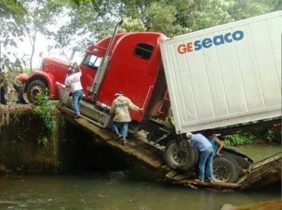 Старый деревянный мостик через речку не выдержал веса тягача с полуприцепом и разрушился. Понятия не имею, как они теперь будут его оттуда вытаскивать.