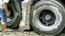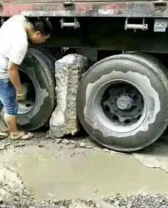 Дальнобойщик поймал "небольшой" камушек между колесами. Обратите внимание, как идеально подошел камень, прямо рай для перфекционистов!