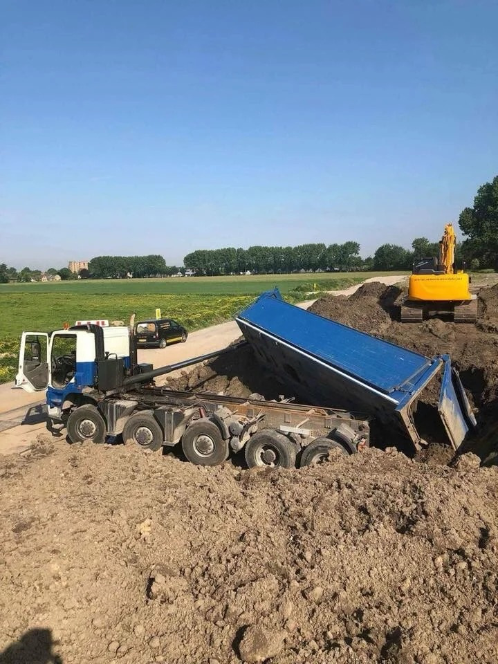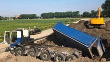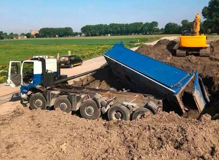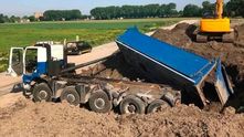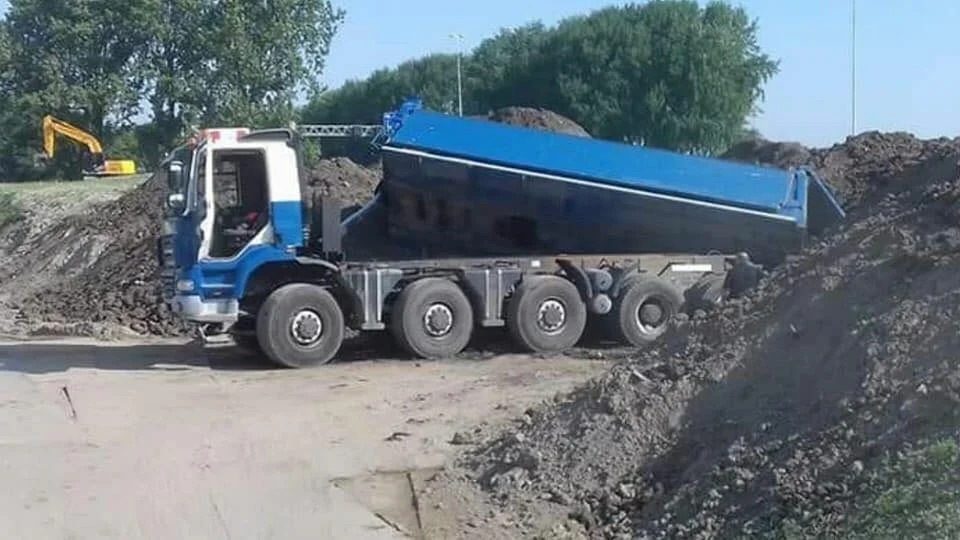 Во время разгрузки у самосвала Ginaf сломалось крепление штока. Кузов сорвало, и он свалился рядом с грузовиком в довольно эпичной позе.