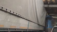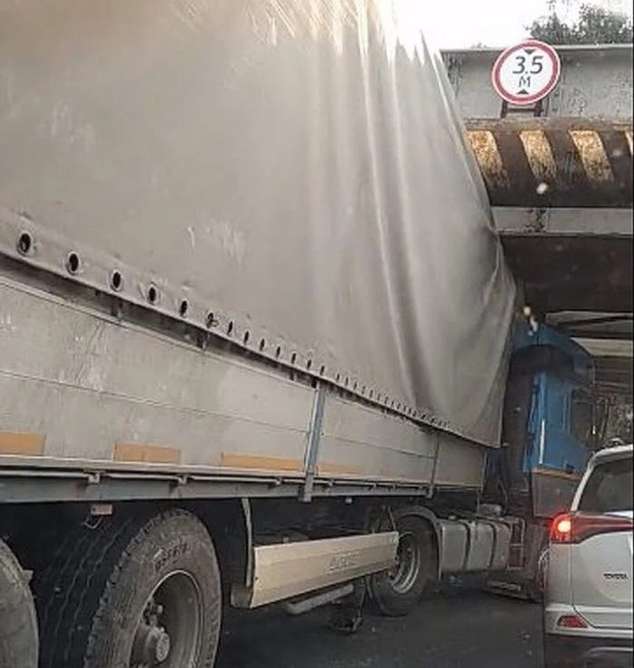 В Екатеринбурге фура не смогла пролезть под низким мостом. Водителю повезло, что тягач Mercedes-Benz Axor не получил повреждений, а пострадал лишь каркас тента полуприцепа.
