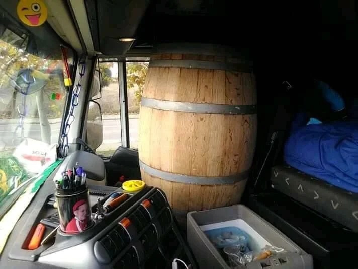 П - практичность! Водитель грузовика в одной из командировок купил дубовую бочку. Но как её довезти? Почему бы не загрузить её прямо в кабину на место пассажира? И у него это получилось, вот только может надо было пристегнуть?