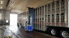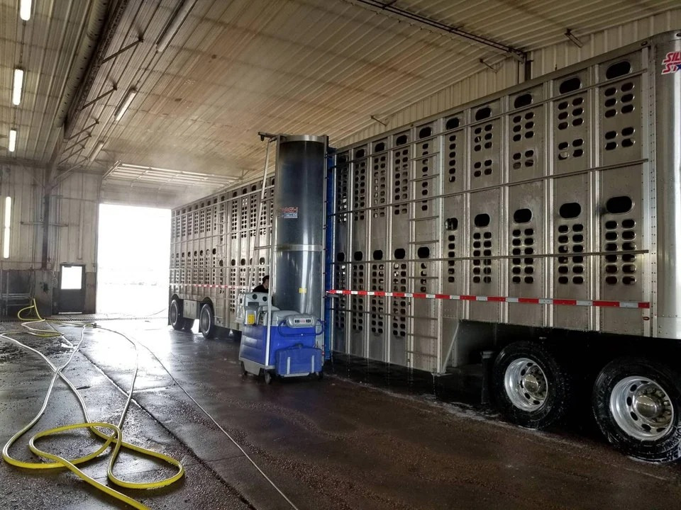 Это полуприцеп для перевозки животных. В нем много отверстий, поэтому придумали специальное приспособление, позволяющее промыть все скрытые полости.