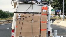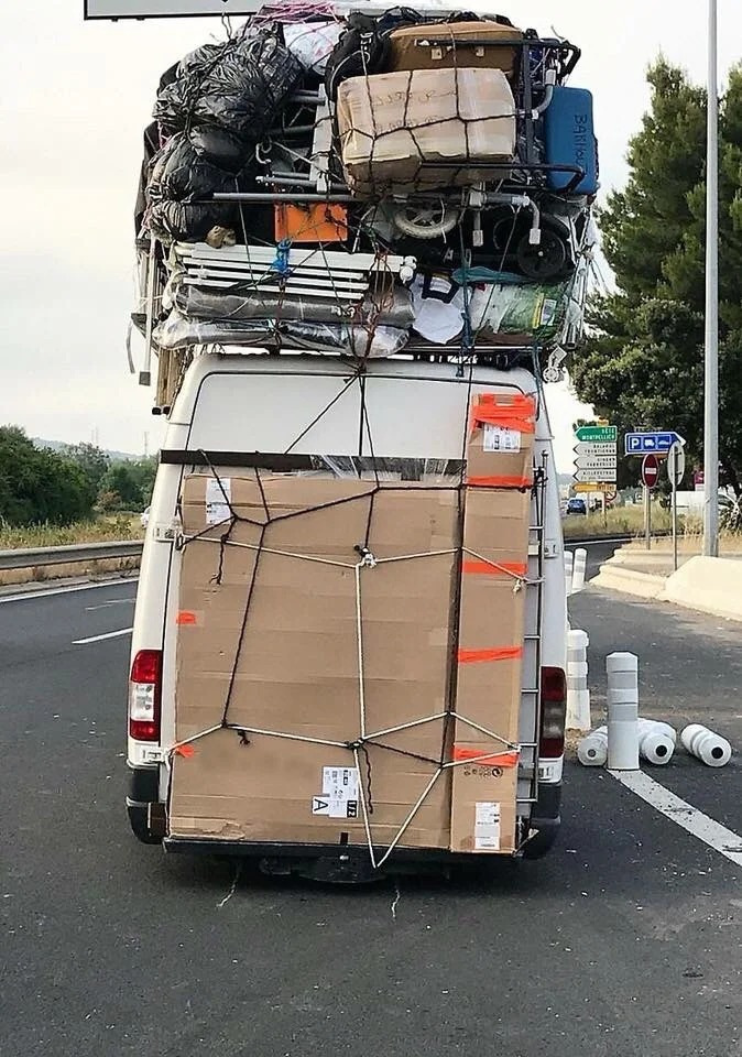 Вот это нагрузил! Фургончик (это Mercedes-Benz Sprinter?) загрузили не только внутри, но и снаружи. На крыше просто огромная гора вещей. И даже сзади закрепили какие-то коробки.