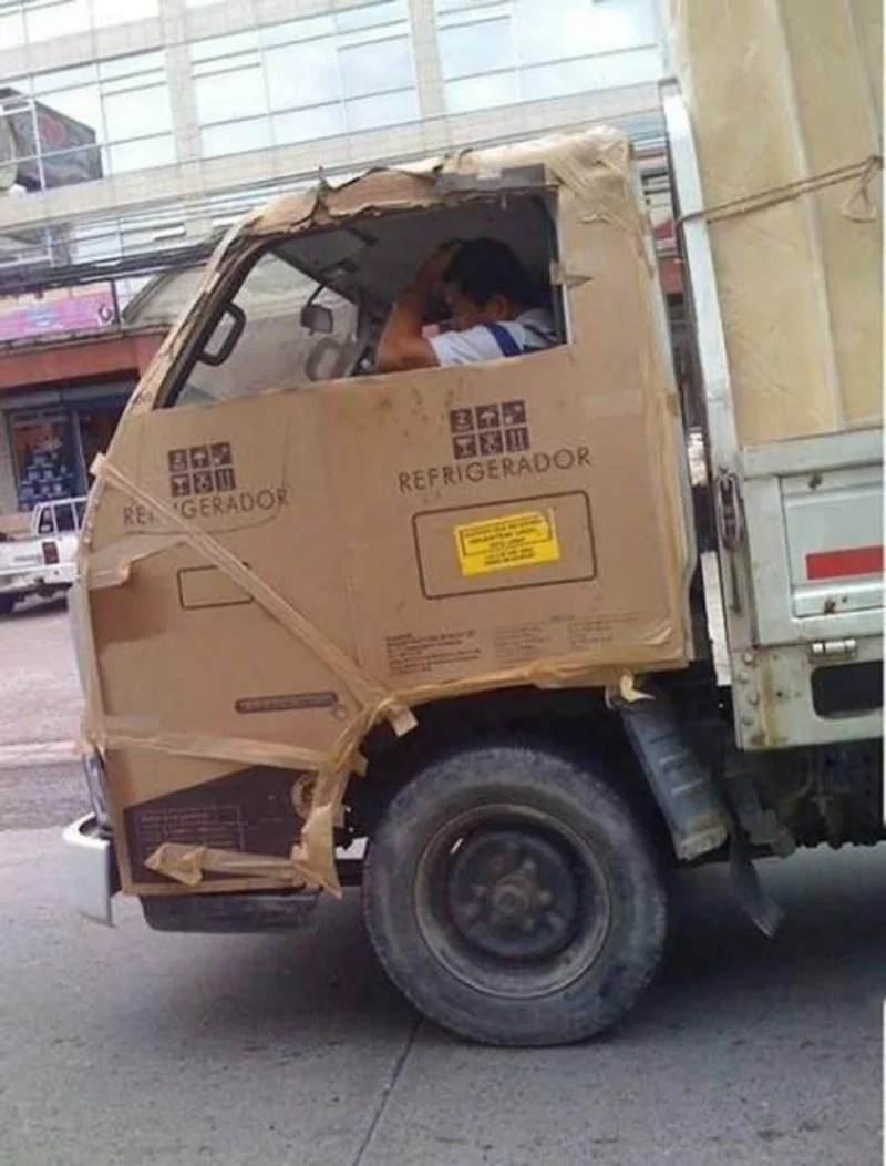 Из чего сделать дверь для грузовичка, если ваша сломалась или проржавела? Лайфхак от парня из Китая: возьмите картонную коробку от любого холодильника и аккуратно вырежьте. Вот и новая дверь, только кажется не открывается.
