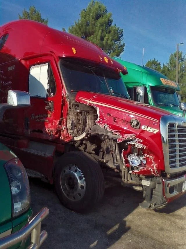 Что же такое могло произойти с этим красавцем Freighliner? Весь правый бок, начиная от переднего крыла и заканчивая спальным отсеком разбит, поцарапан и помят. У кого-то был тяжелый денек...