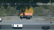Этот кадр достоин музея современного искусства. Самосвал КамАЗ съезжал на обочину и, по какой-то причине, завалился на бок. Весь его груз оказался на земле. Снимок с дрона выглядит довольно необычно.
