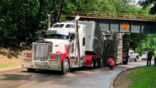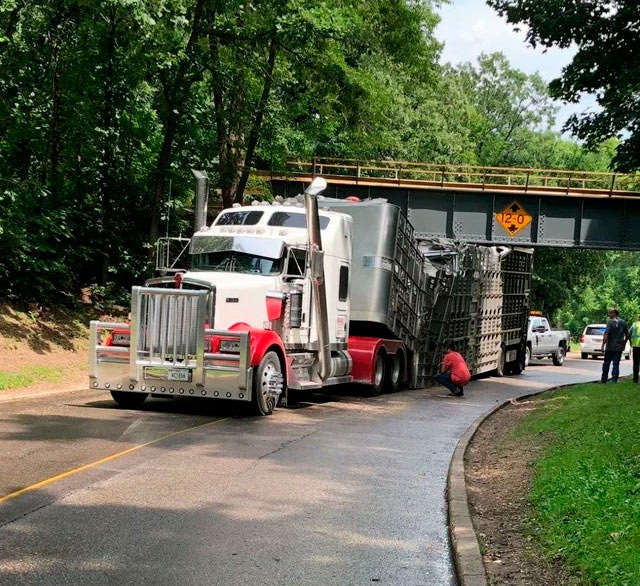 И снова Америка, и вновь низкий мост, под которым не смог проехать красавец Kenworth W900. Первым звоночком должны были стать трубы, которые не прошли под мостом, но водитель почему-то решил продолжить движение и уничтожил свой прицеп.