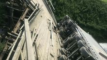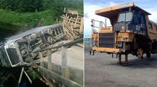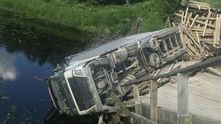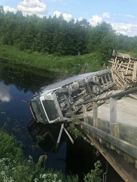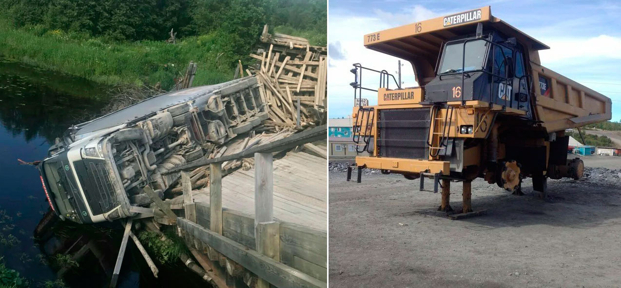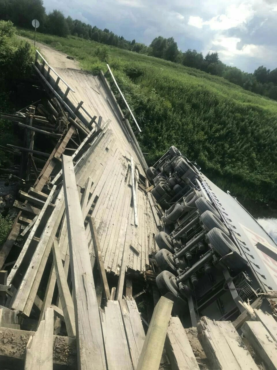Он заехал на полностью загруженной фуре с пиломатериалами на старый деревянный мост грузоподъемностью 3 тонны. И как его теперь оттуда доставать?