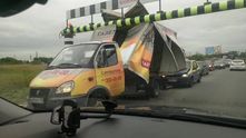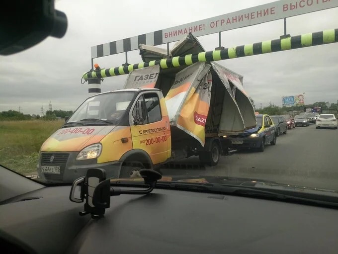 Водитель этой ГАЗели, видимо, часто ездит на легковых автомобилях и совершенно забыл про то, что у него высокий фургон. В итоге он не смог проехать под ярко-раскрашенным трубопроводом, уничтожив свой фургон и повредив следовавший сзади Renault Logan.