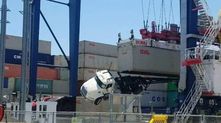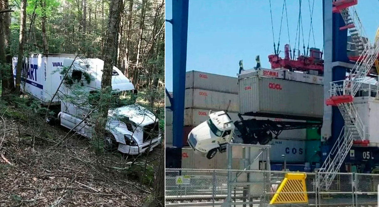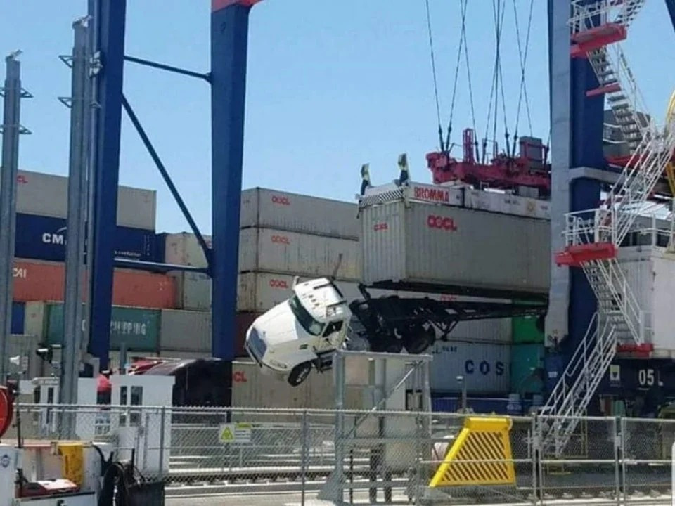 Оу! Водитель забыл отсоединить крепления контейнера в порту. Кран поднял его вместе с грузовиком. Удивительно, что рама прицепа хоть и скрутилась, но не сломалась и выдержала вес тягача!