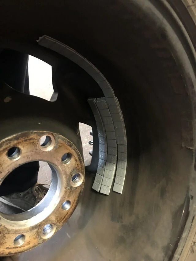Никогда не задумывались о том, насколько сложно бывает балансировать грузовые колеса? Посмотрите на эту фотографию. Мастерам понадобилось 45 грузиков, чтобы хоть как-то уравновесить вращение колеса.