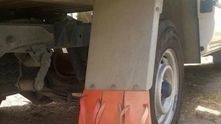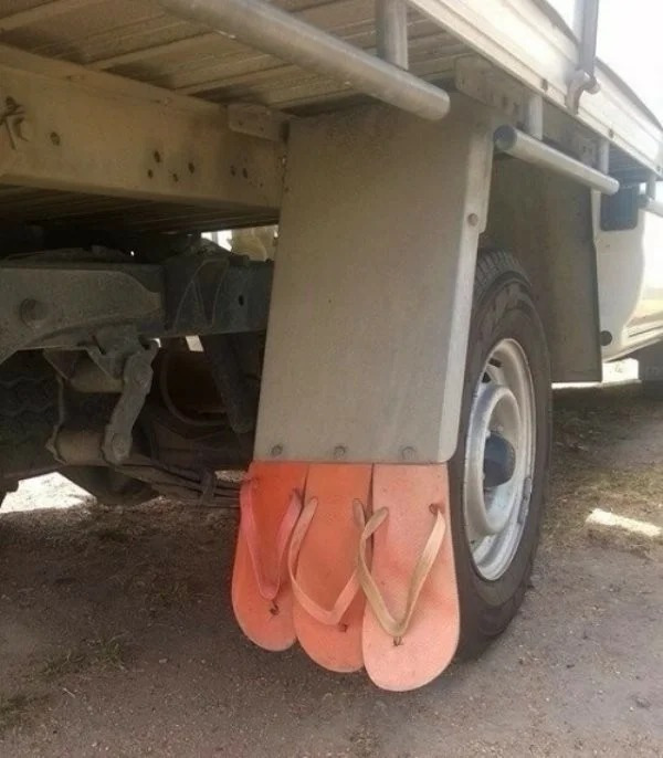Брызговики - одна из тех вещей, которые постоянно теряются, особенно на грузовиках. Оригинальные брызговики стоят немалых денег, поэтому водители выкручиваются как могут. Например, этот использовал пляжные шлепки. Креативно и эффективно!