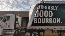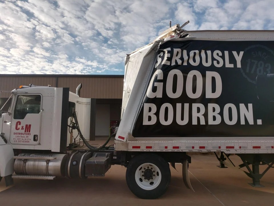 Надпись на полуприцепе гласит "Действительно хороший бурбон". Интересно, пробовал ли его водитель перед тем, как решил проехать под "действительно низким мостом". Да, не весь бурбон одинаково полезен, даже если он "действительно хороший".