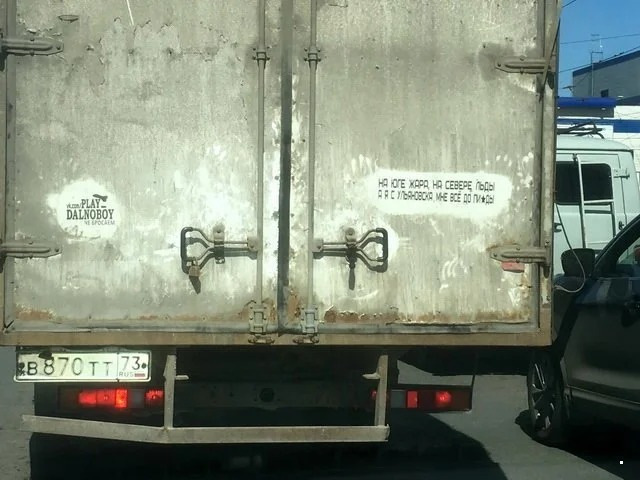 Еще один любитель креативных надписей на фургоне. Водитель с гордостью сообщает, что он из Ульяновска и ему наплевать на то, что на юге жара, а на севере льды. Да и на всё остальное тоже, наверное. В Ульяновске все такие?